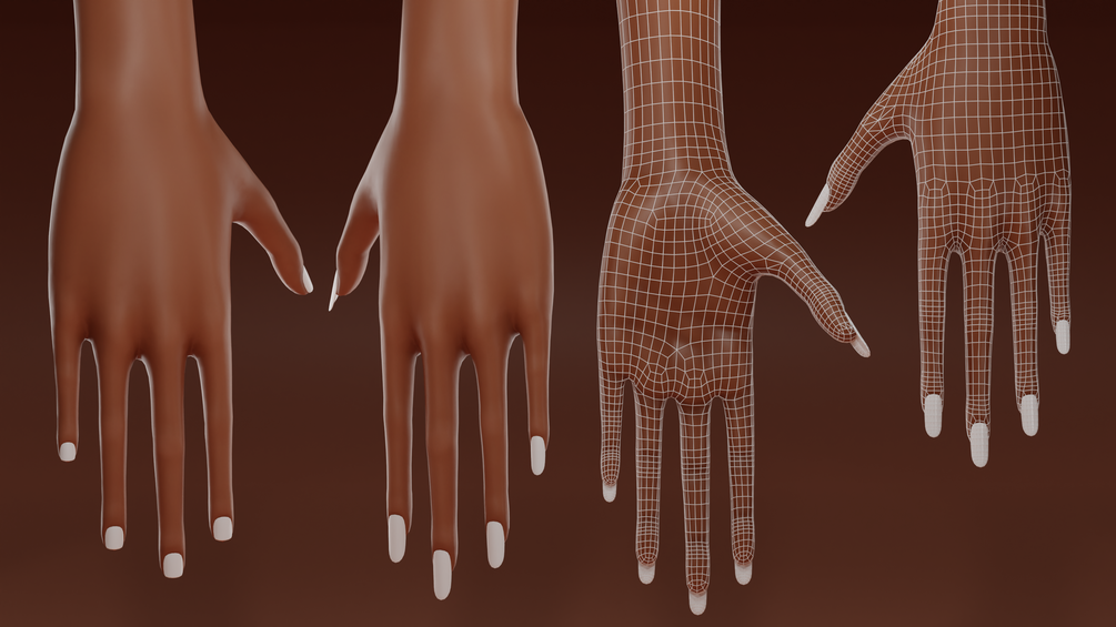 As for the nails, I made two alternative versions with separate meshes so that you can merge the one you prefer to the base. As you can see on the UV map, each side of the nail has its own space in the same texture. By default they will be painted white so you can easily edit them to your liking.